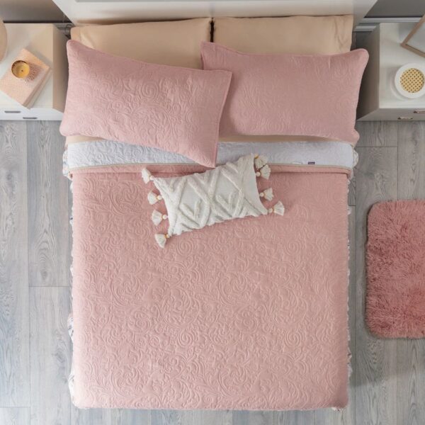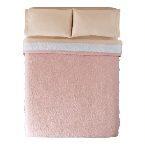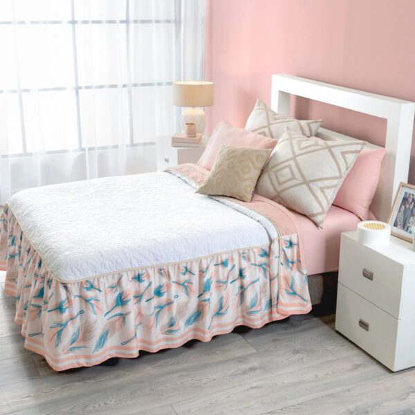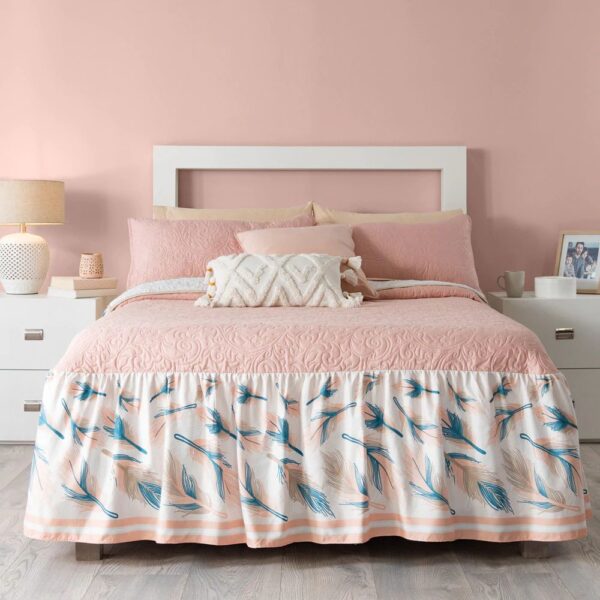 Colcha con holán estampado y capitonado especial, suave por su textura viasoft. Complementa con fundas y cojines.