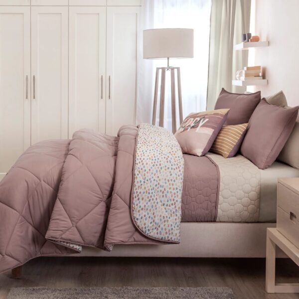 Un atractivo estampado de pequeñas y coloridas formas circulares dan a este edredón un estilo vanguardista y chic. La combinación con el color lila lo hace más llamativo dando a tu espacio una chispa de tendencia. Juego de edredón doble vista. Suave por su textura Viasoft. Incluye cubrecama, fundas decorativas y 2 cojines.