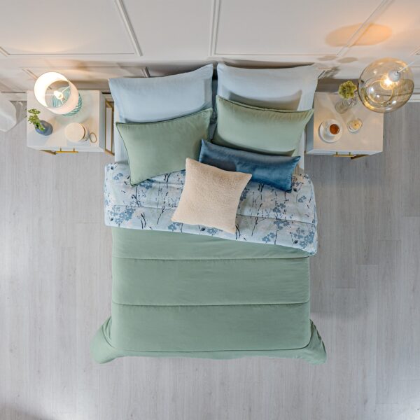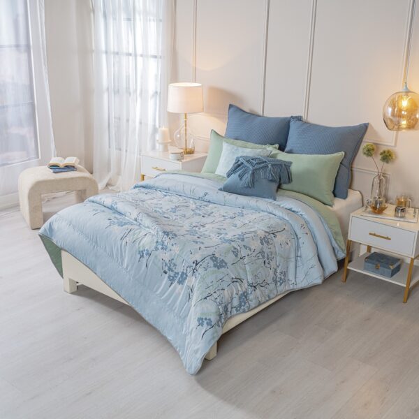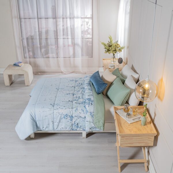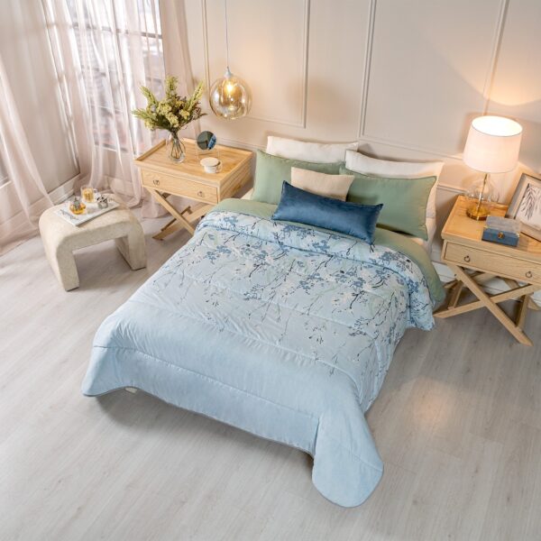 Edredón Tolosa en tonos azul y verde, elegante estampado floral que aporta frescura y color a tu dormitorio. Hecho de materiales suaves para un descanso placentero y un ambiente relajante.