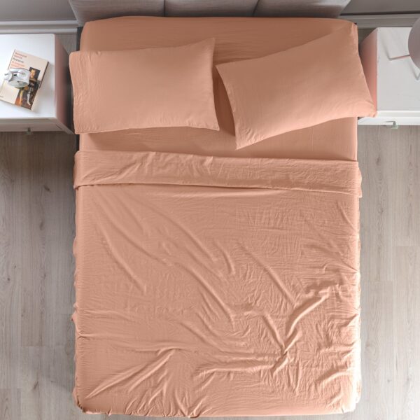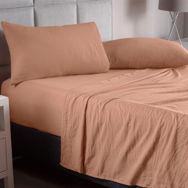 Sábanas de microfibra con tratamiento Washed que les da máxima suavidad con acabo tipo lino. Color súper resistente. No encogen. Color liso para combinar con tus edredones.
